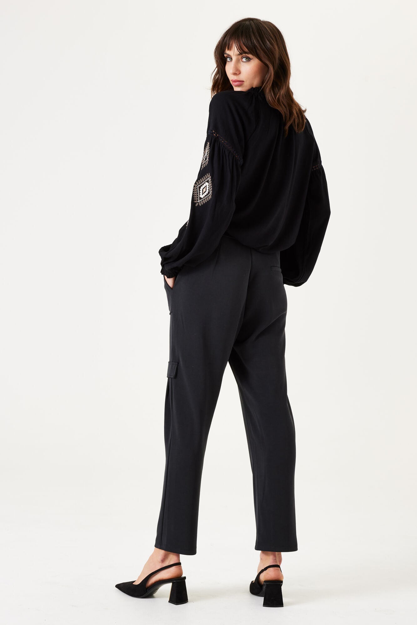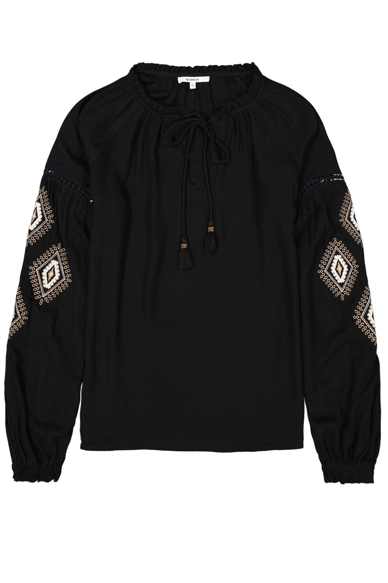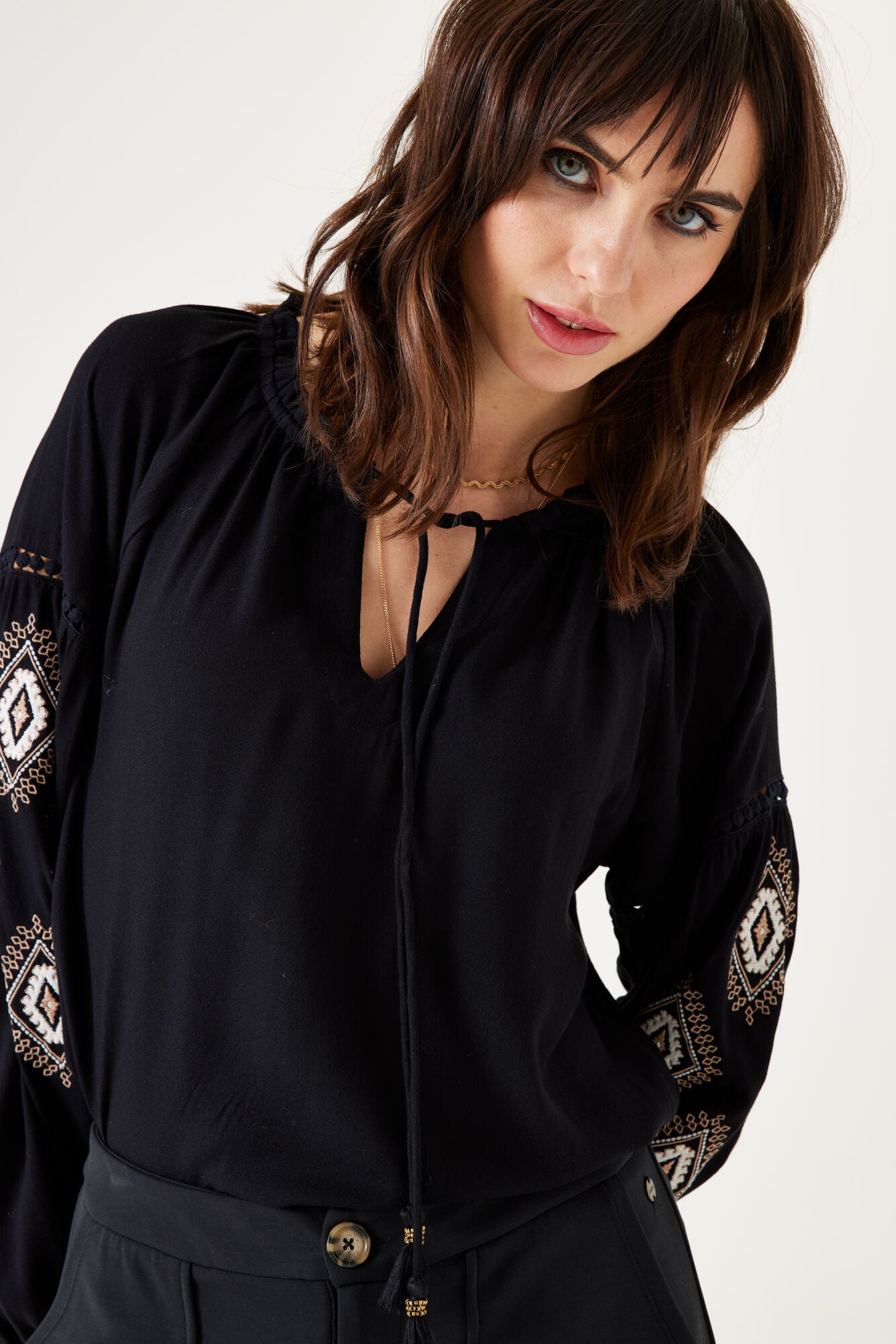 Crepe blouse with embroidery. A trendy item like this is essential this season! This blouse features long raglan sleeves, a serafino neckline with tie straps, and a generous fit.