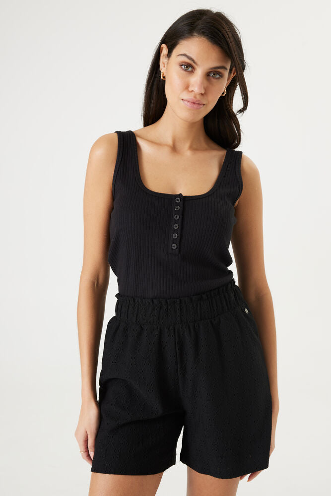 Experience ultimate comfort and style with our Black Singlet! Featuring a button detail and shoulder strap that is wide enough to cover your bra strap, this lightweight and ribbed singlet is perfect for any occasion.