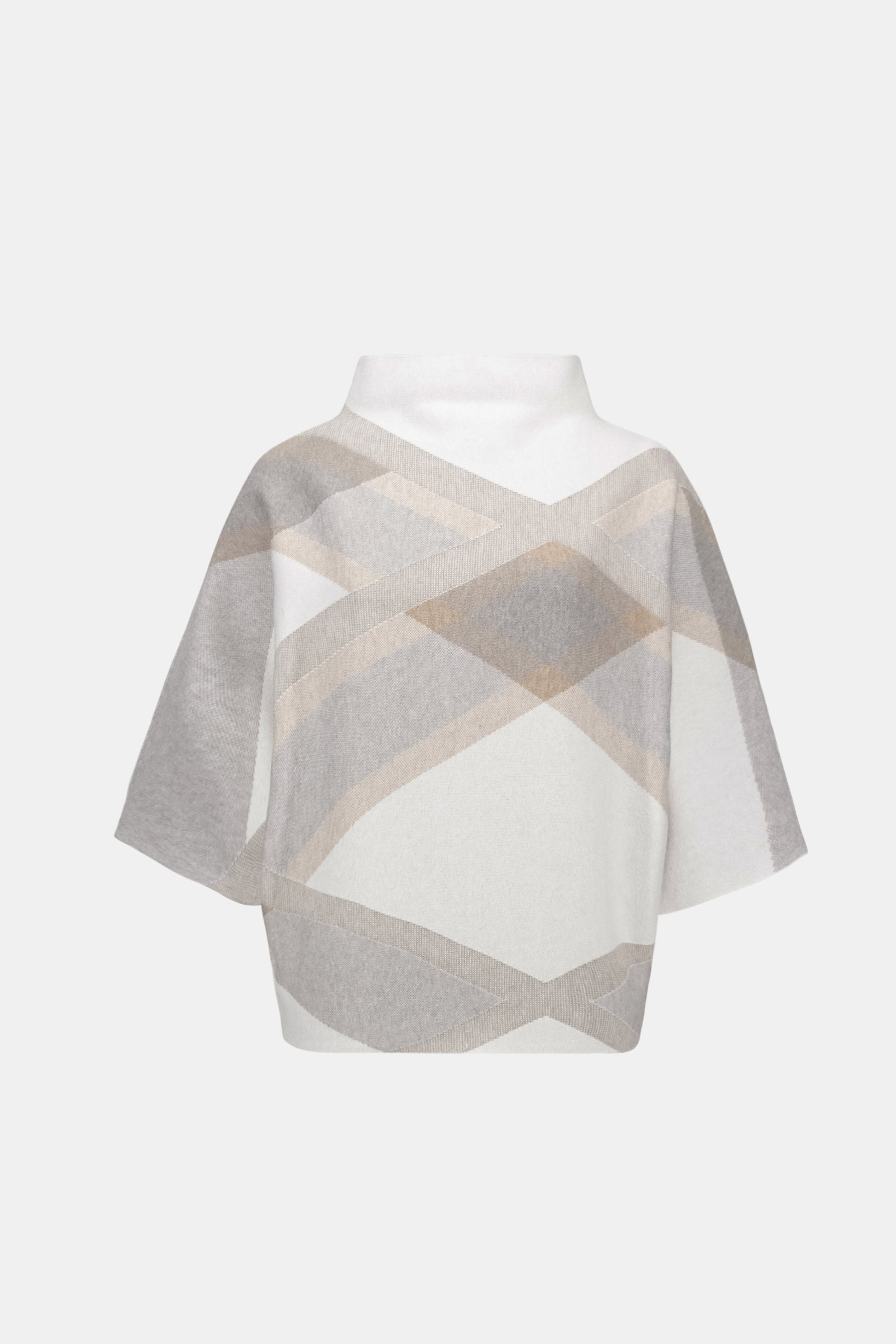 This brushed viscose and nylon blend sweater features a plaid jacquard design with a funnel neckline and bell-shaped three-quarter sleeves, offering a relaxed boxy silhouette that balances comfort and style.