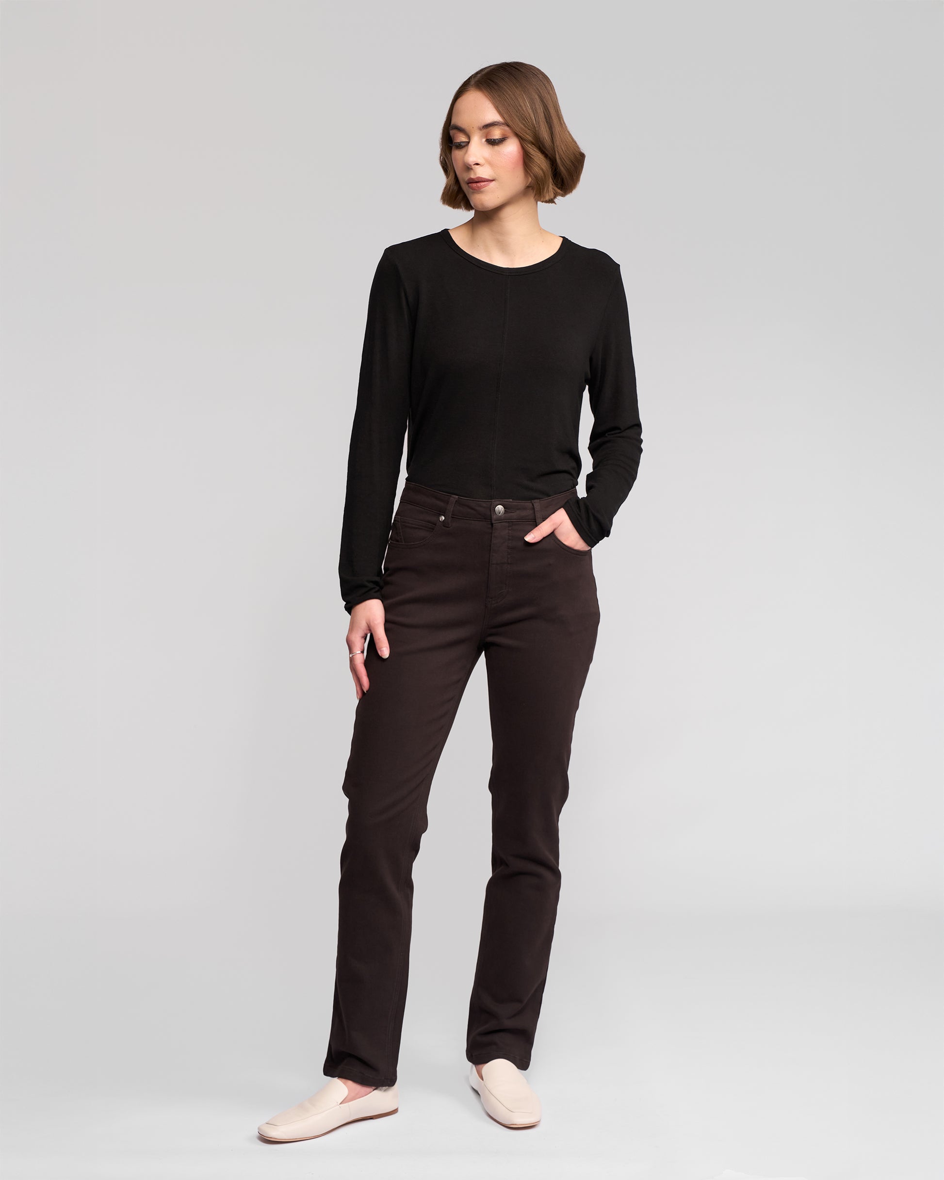 Slim-leg full-length jean in Chocolate — a rich dark brown. Made from a soft cotton–tencel blend with stretch, this winter-weight style offers warmth, comfort, and a smooth feel while maintaining a refined denim look.