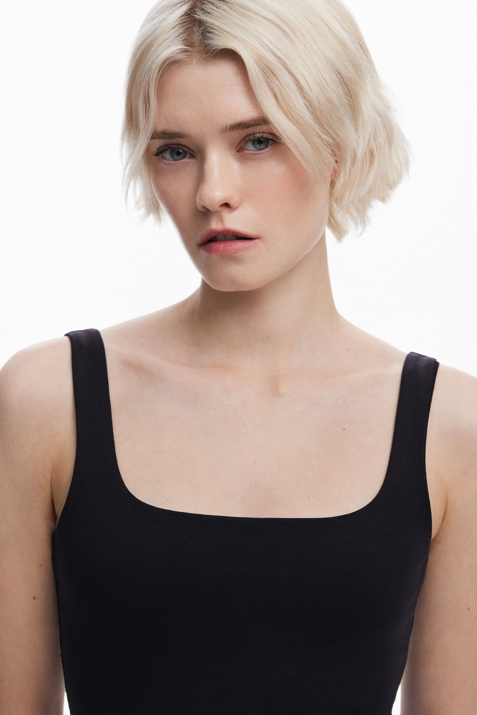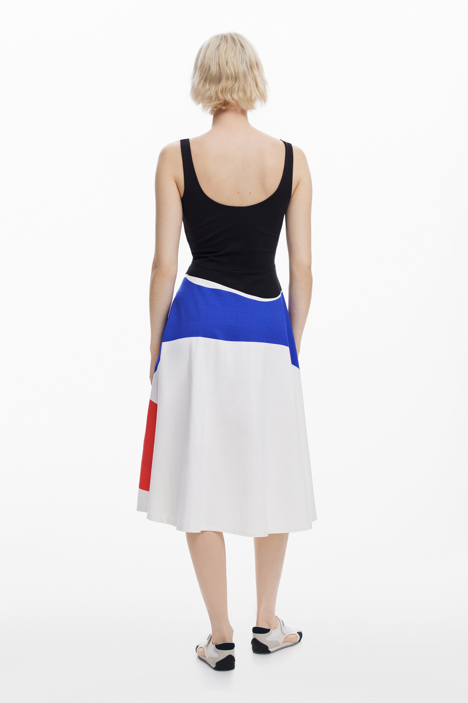 Midi dress with flared skirt, round neck, straps, and floral and wave print designed by Monsieur Christian Lacroix.
