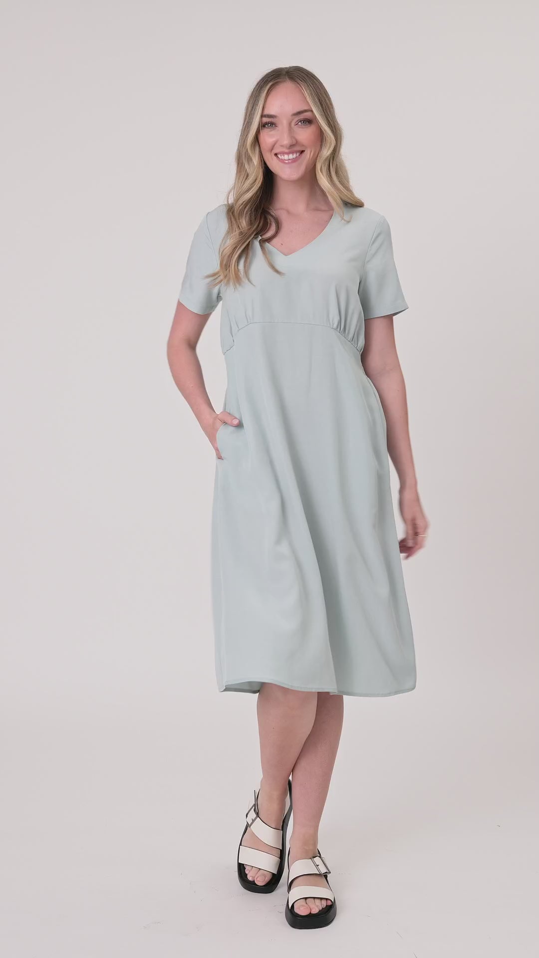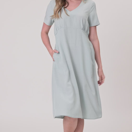 - Features gentle gathers just under the bust and a knee-length silhouette.