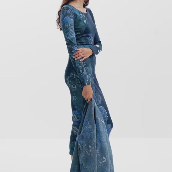 Fitted midi dress, long-sleeved and round neckline in blue with mandala print.