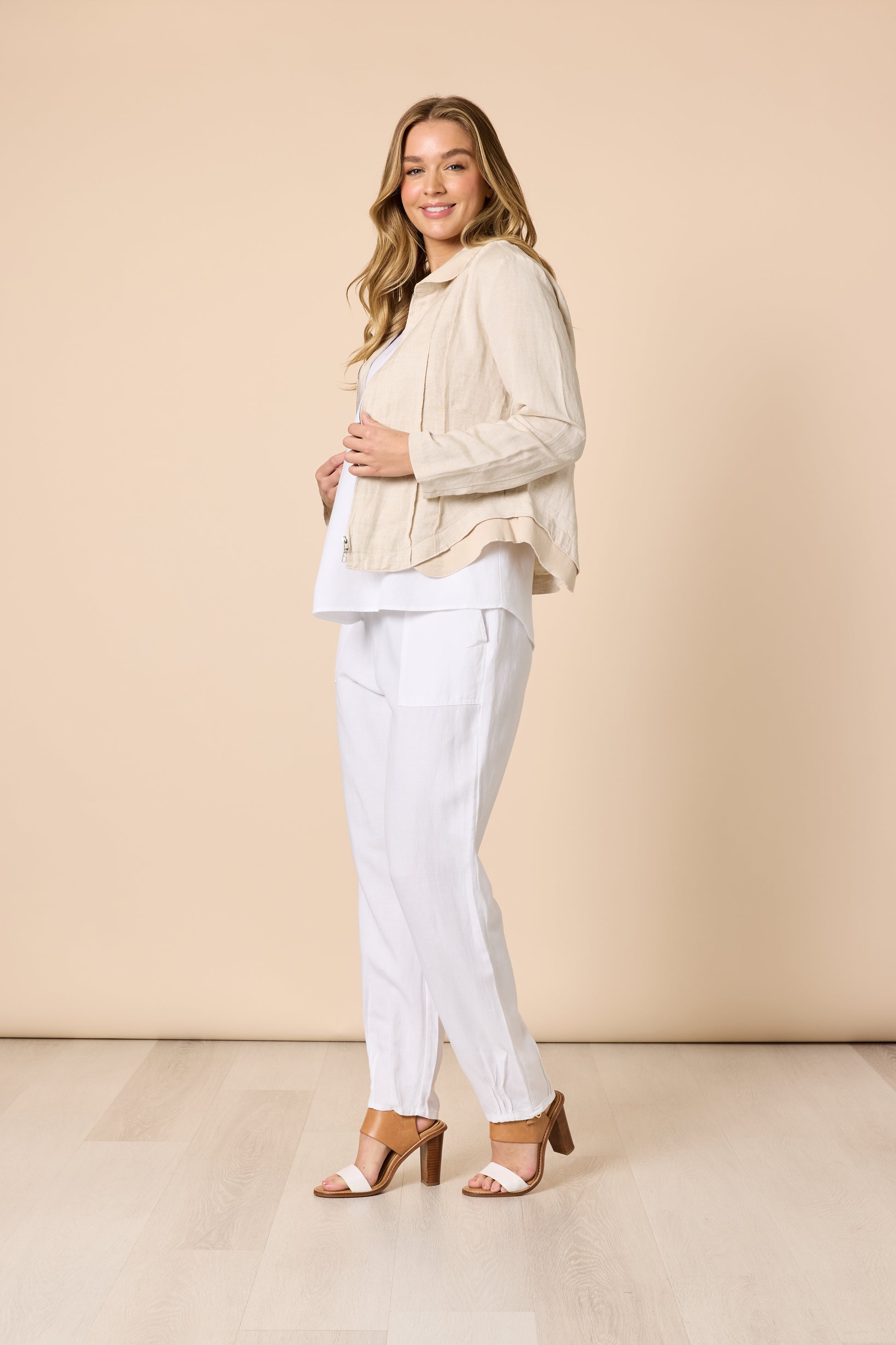 - Perfectly placed pin tucking for a slightly tapered hem, creating a slimming look.
