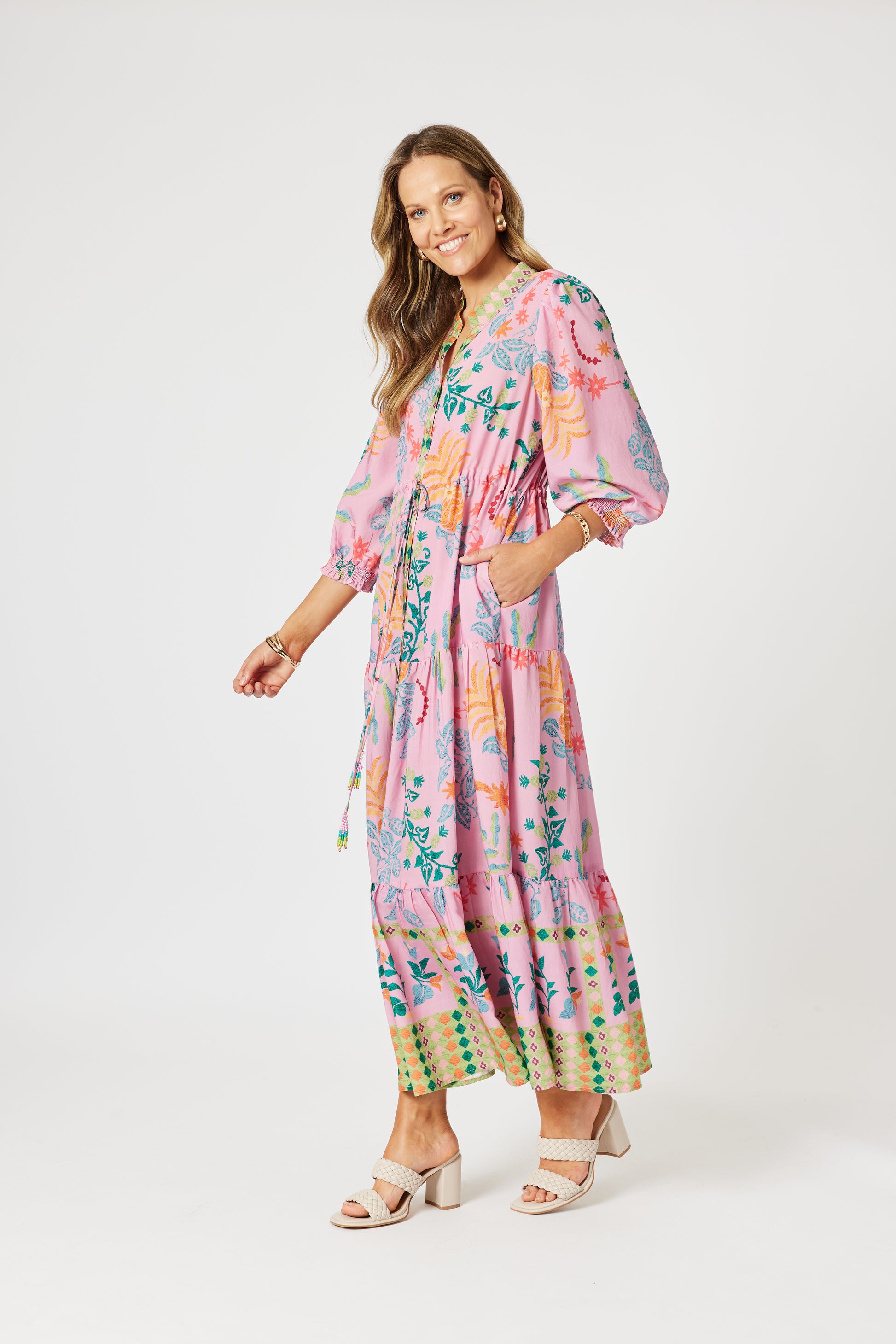 Add a splash of fun to your wardrobe with the Mardi Gras Printed Dress. This playful pink printed dress features a pull-in waist tie finished with stunning beaded tassels for a touch of flair. Elasticated cuffs offer comfort and a relaxed fit, while the button-up front lets you wear it closed or open as a breezy duster. Perfect for layering or making a statement on its own.