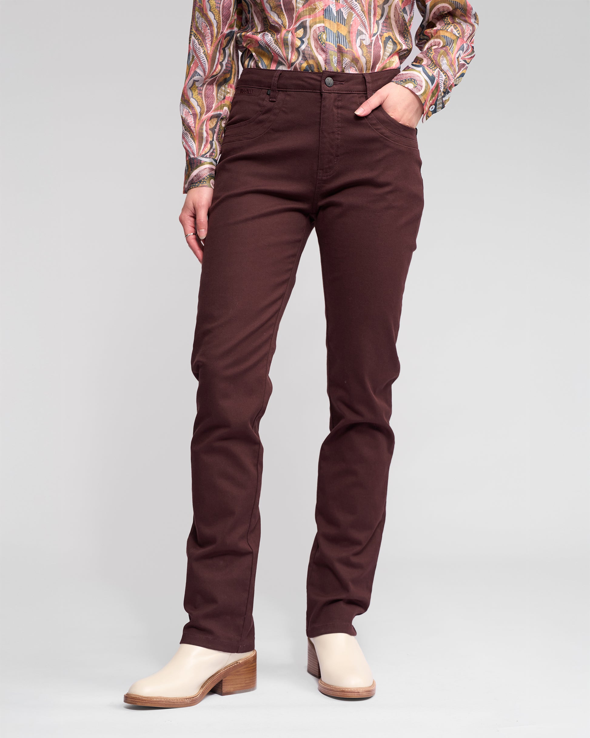 Slim-leg full-length jean in Merlot — a deep maroon red that adds warmth and depth to your denim wardrobe. Designed in stretch denim for comfort and shape, this style features classic five-pocket styling with refined seam detailing and signature ‘V’ branding for a polished, everyday finish.