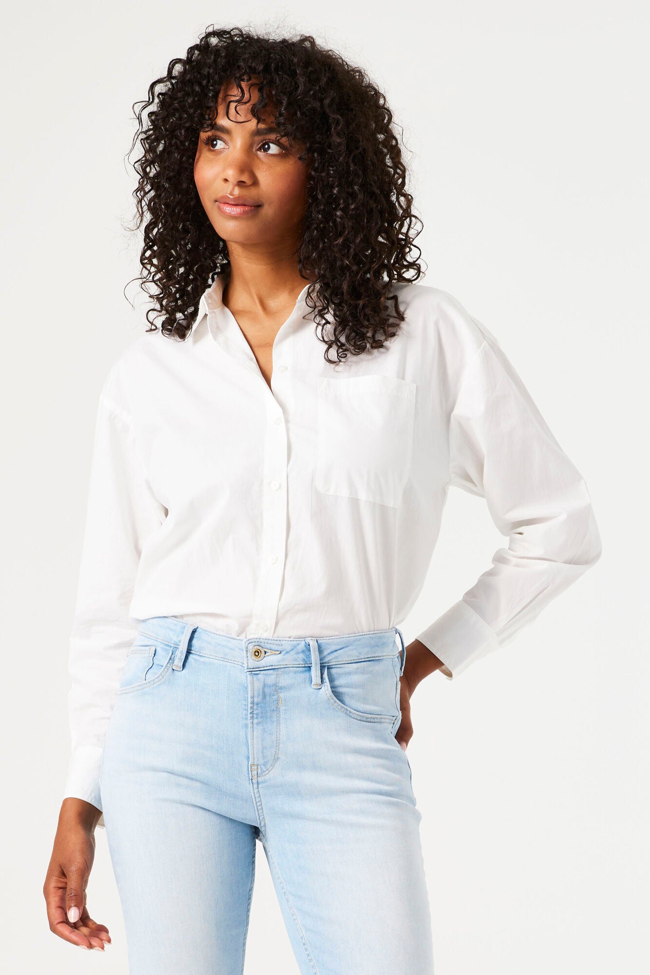 Poplin cotton blouse with chest pocket. Create a cool look with this item. This blouse has long sleeves, a collar, a button closure, and a loose fit. This item is made of 100% cotton.