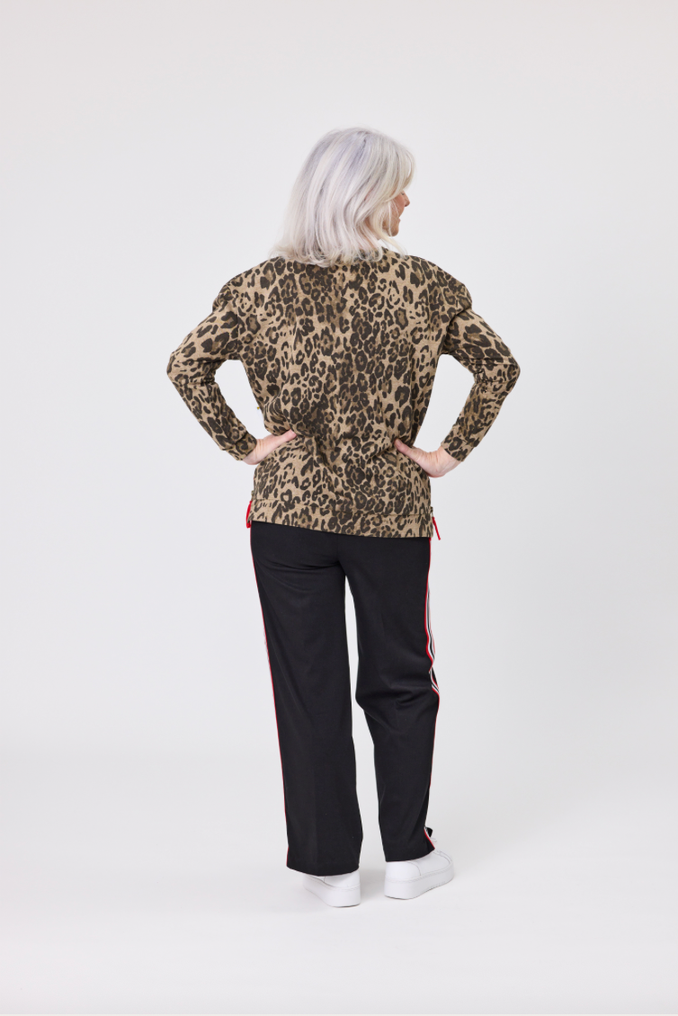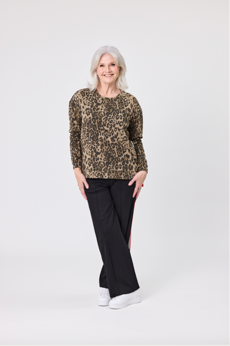 Slip into effortless style with this playful leopard-print sweater. The relaxed silhouette and crew neckline offer cozy comfort, while side-seam zips add an unexpected twist. Finished with banded cuffs and hem for a polished look that's anything but boring.