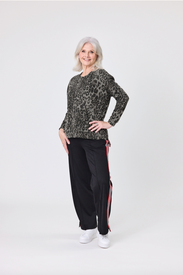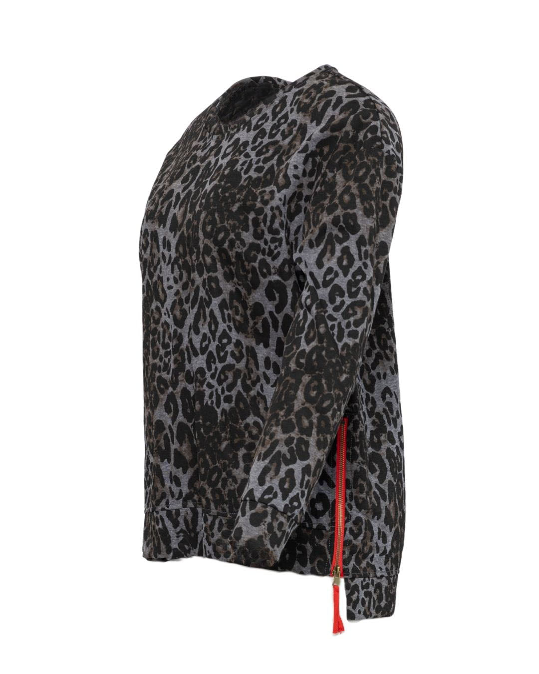 Slip into effortless style with this playful leopard-print sweater. The relaxed silhouette and crew neckline offer cozy comfort, while side-seam zips add an unexpected twist. Finished with banded cuffs and hem for a polished look that's anything but boring.