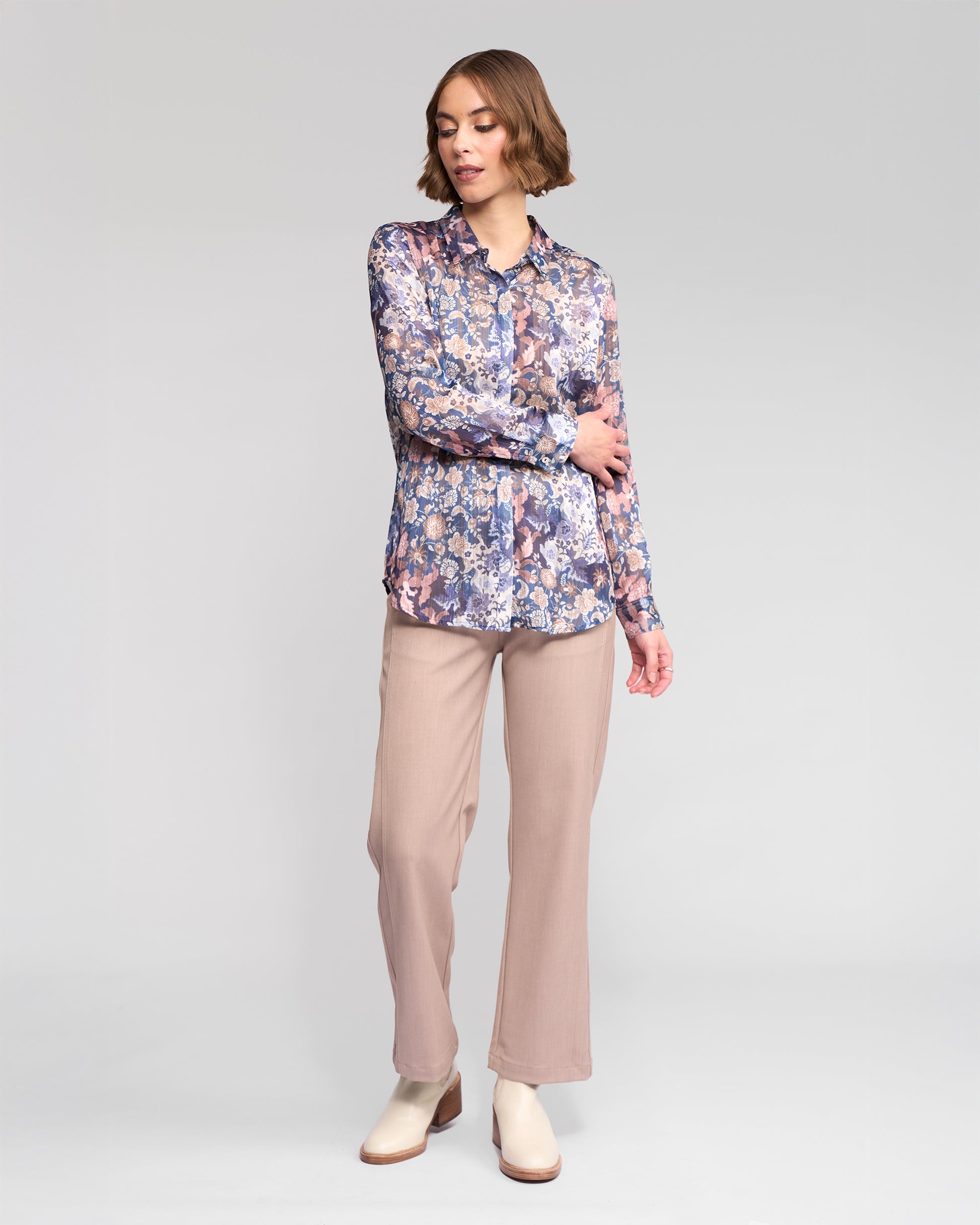 A formal long-sleeve chiffon shirt in our Sable print — a paisley-inspired design in green, white, and merlot, finished with subtle gold lurex striping. Designed with a clean front opening and statement button detailing through the back, this loose-fit style has a fluid, elegant drape.