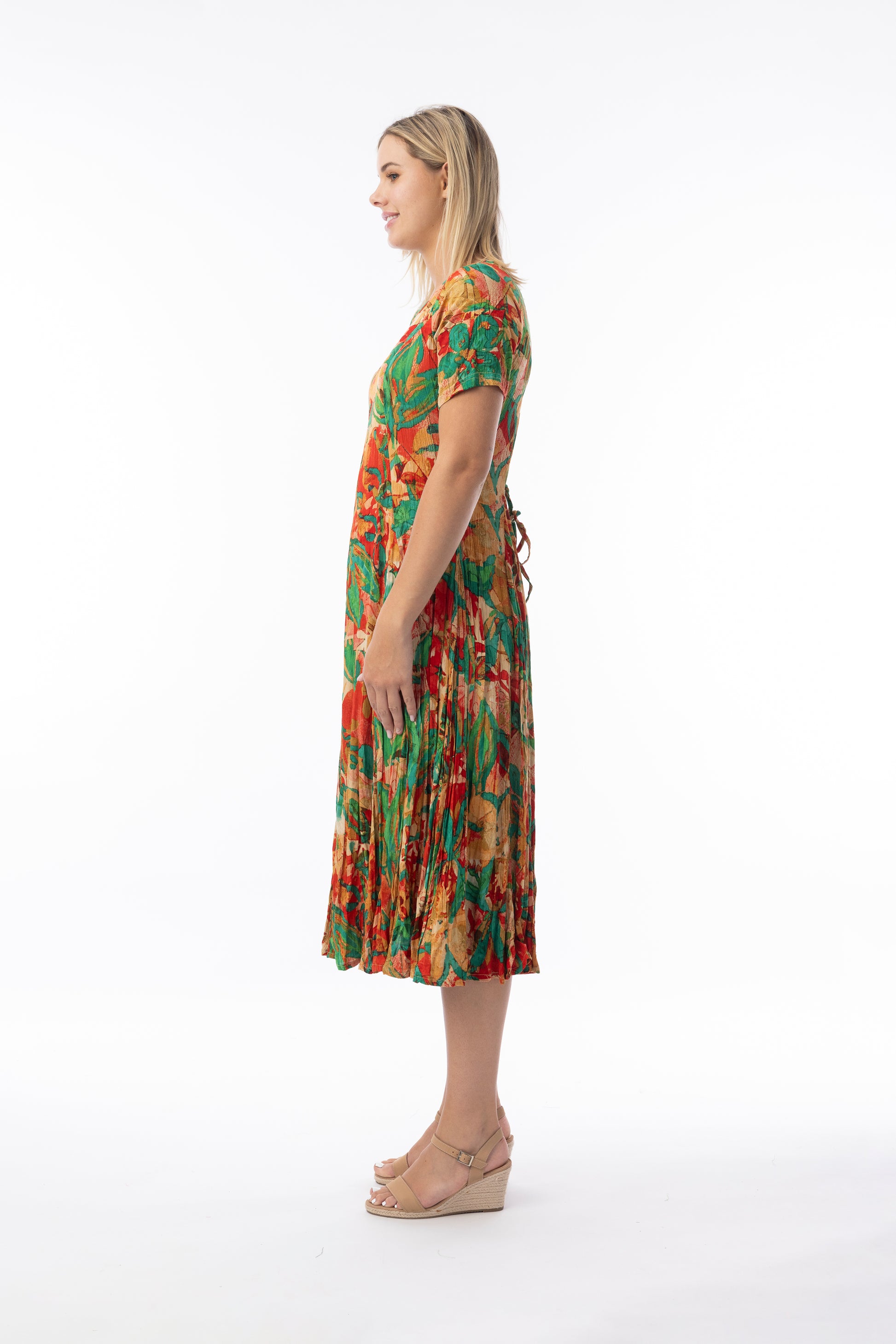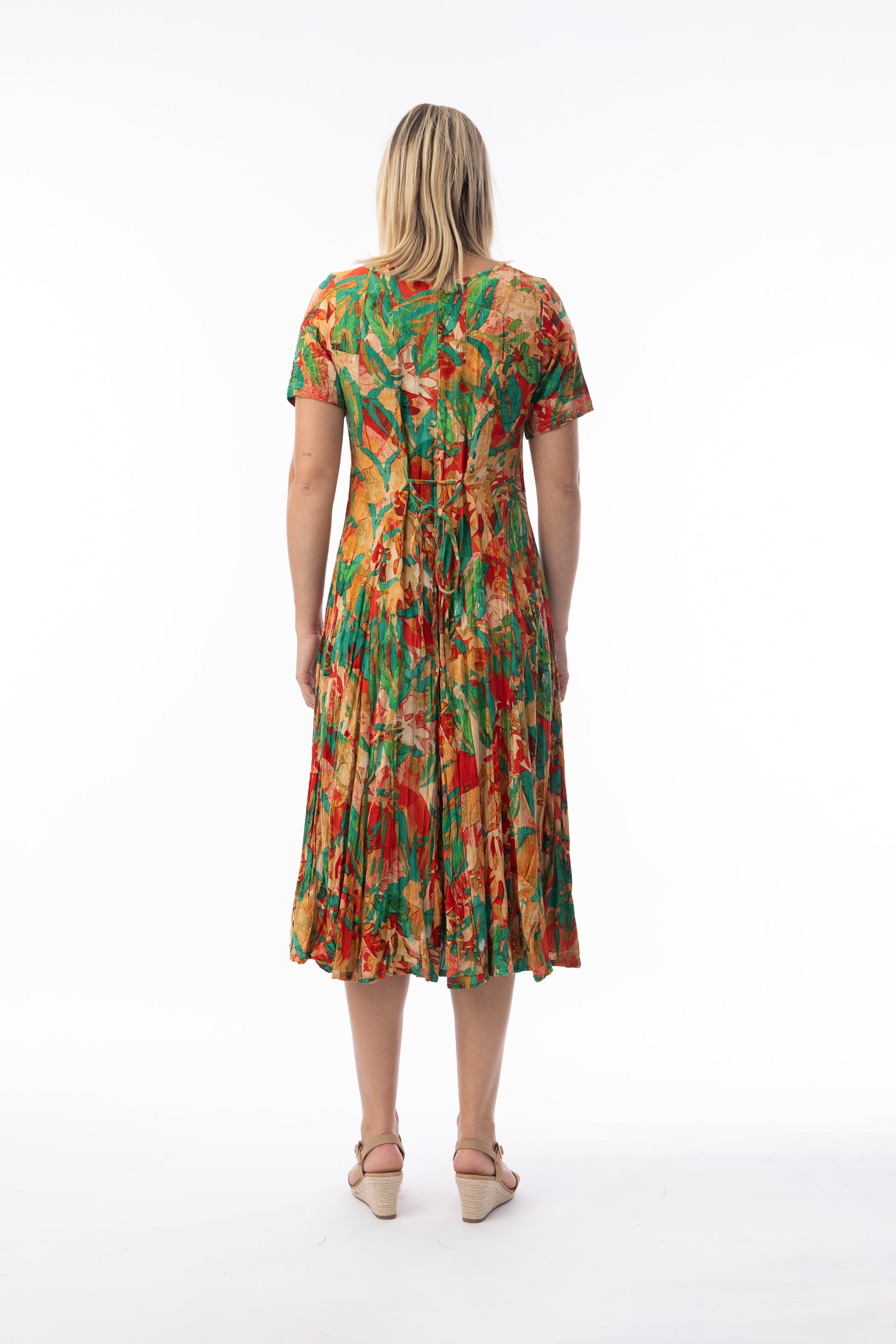 Flaunt your summer style with our stunning Godet dress. Made from natural fibres, it features short sleeves, a flattering v-neckline, stunning colourful print, and godet panels through the skirt that create a beautiful drape and swing in the skirt. Ideal for enjoying warm summer days, this dress combines comfort and style effortlessly.