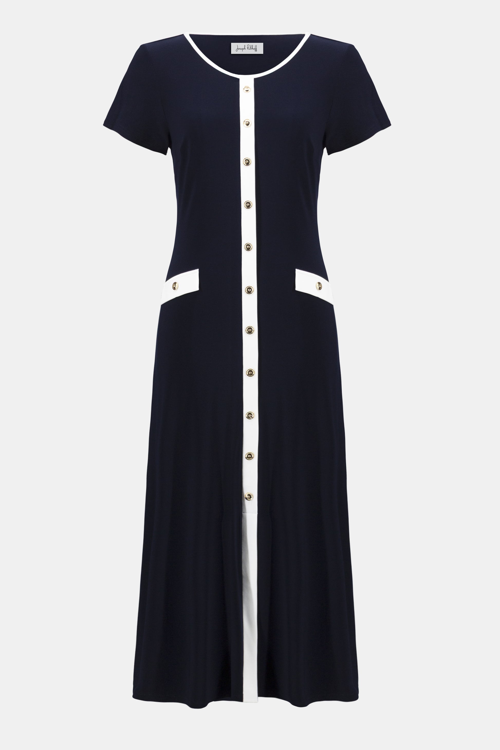 Bold and polished, this silky knit A-line dress features graphic color blocking, a scoop neckline, cap sleeves, and refined details like a faux button placket, flap accents, and side slits.