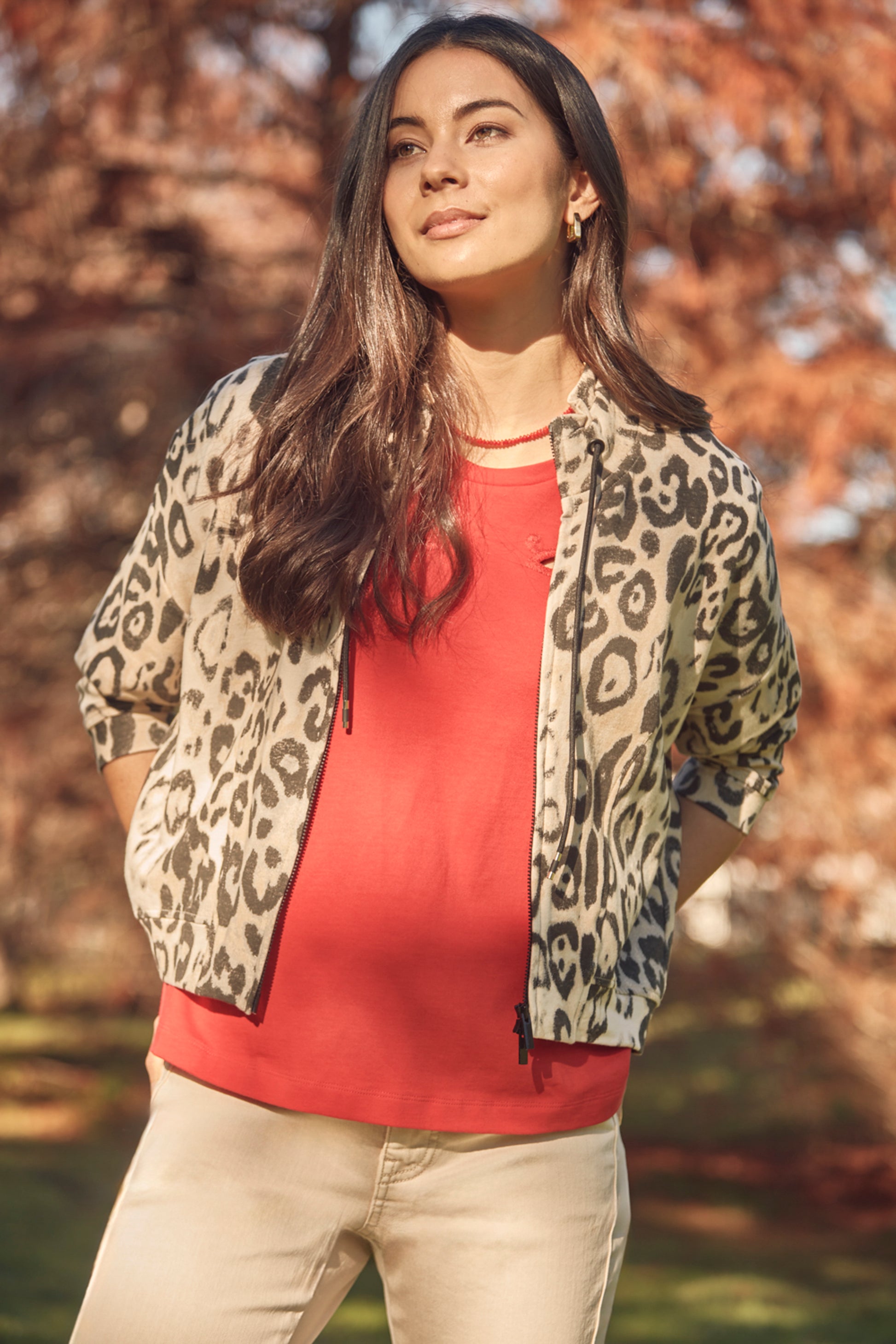The finishing touch your wardrobe’s been waiting for. The Suave Jacket is crafted in Verge’s exclusive animal print cotton-elastane knit to match perfectly with the Charm Pant, Suave Sweater and Pant. A modern update on the everyday layer, it features a relaxed fit with a flattering scooped hem, zip-through front, and eyelet tie detail at the round neckline for a fresh, contemporary twist. The ¾ sleeves keep it effortless and versatile. Wear it back with the matching set or throw it over a tee and jeans to instantly elevate your everyday look.