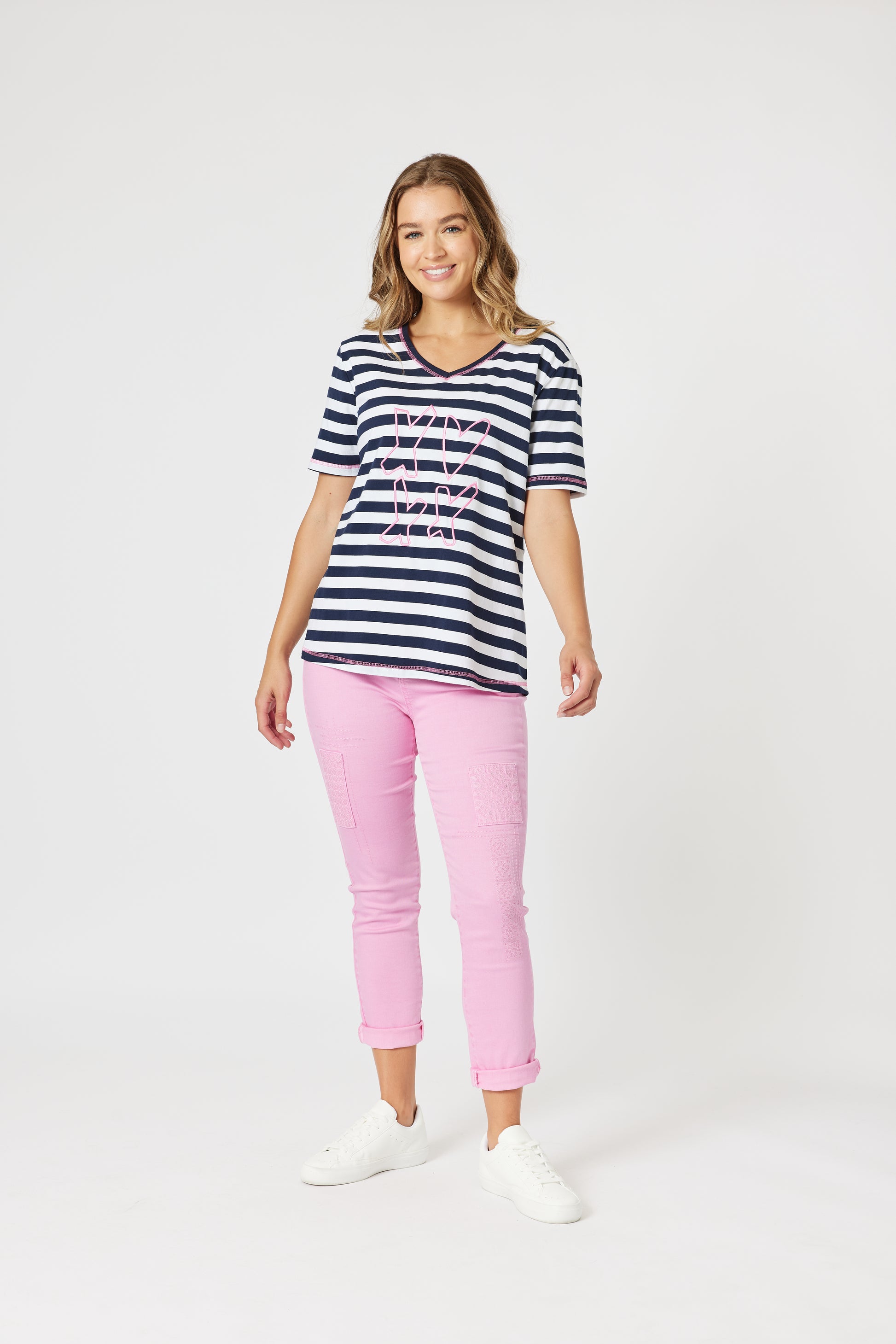 - Brighten up your denim collection with the Patch Embroidered Jean in playful flamingo pink.