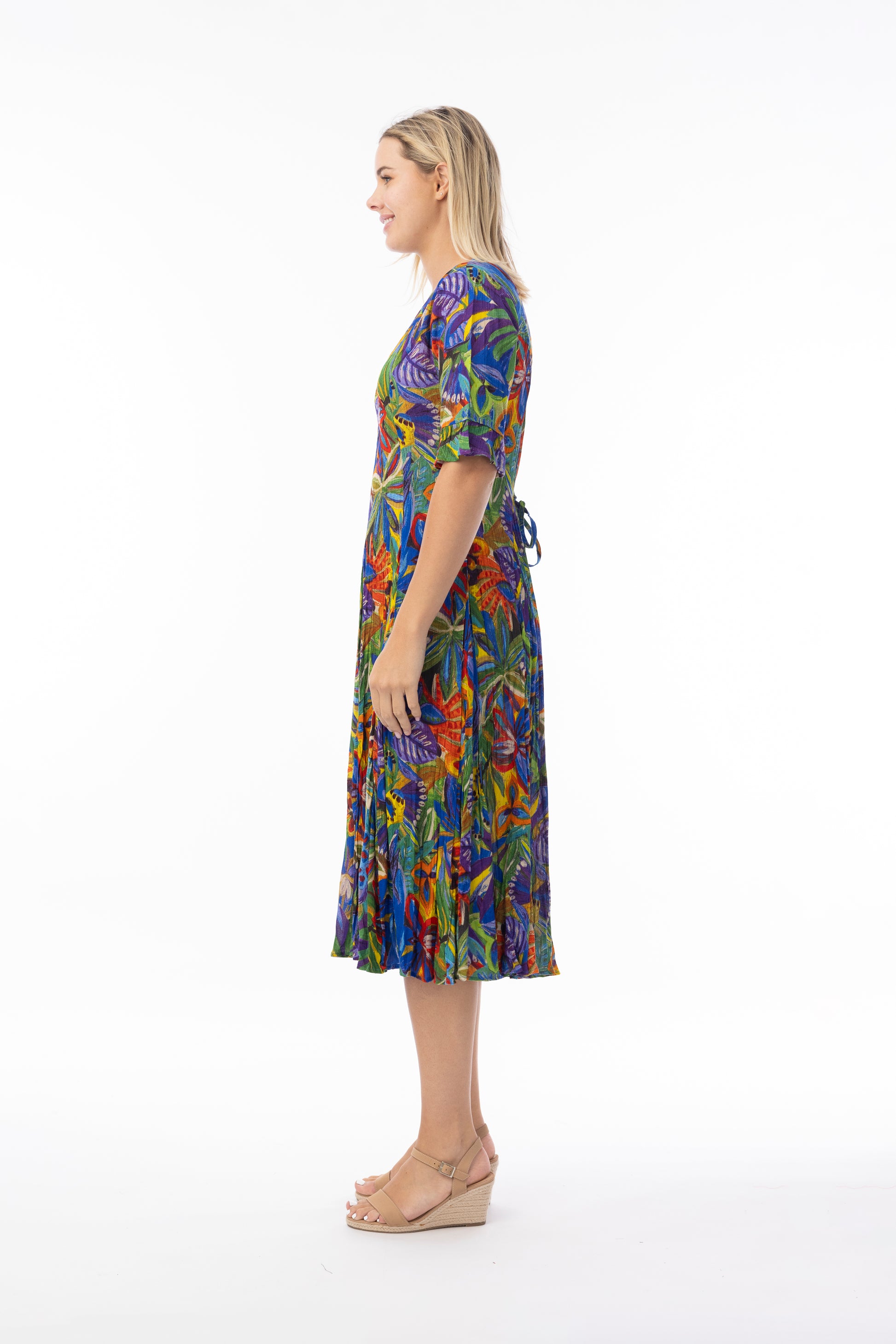 Flaunt your summer style with our stunning Godet dress. Made from natural fibres, it features short sleeves, a flattering v-neckline, stunning colourful print, and godet panels through the skirt that create a beautiful drape and swing in the skirt. Ideal for enjoying warm summer days, this dress combines comfort and style effortlessly.